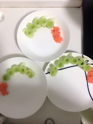 牛肉切片腌上,黄瓜用打皮的顺长打一长条,卷好,胡萝卜切成小花形状!摆盘!