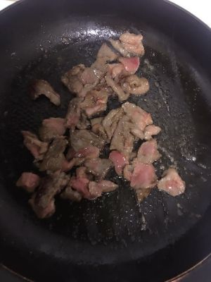 锅里倒油烧热将切好的葱蒜放一半进去,姜片全放爆香放入肉片翻炒至发白,放一勺花椒面,半勺八角面,一勺盐炒至肉熟透,这里可以适当的加点水让肉熟透