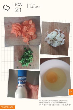 胡萝卜切小花片,西兰花炒熟切小丁,切点葱片,鸡蛋一个,准备幼儿专用盐