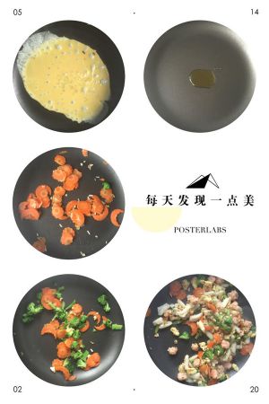 锅中放油,放入鸡蛋炒好,鸡蛋我也放了些剩下的奶酪,另起锅放入葱末,炒香放入胡萝卜,翻炒一会,放入西兰花,再放入蒸好的虾球,翻炒过后放入盐和婴儿酱油,最后放入煮熟的猫耳朵,翻炒过后起锅装盘即可