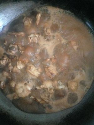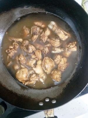 调料爆香之后下鸡翅翻炒, 加适量白糖, 鸡块焦黄之后加入温开水, 再加入生抽,老抽料酒,适量。老抽点一点就可以了。我的放多了。