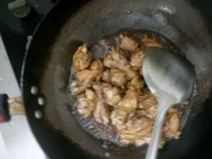 放油烧热,放入姜丝炒香,倒入鸡块翻炒。 放入适当的料酒,生抽,糖,醋,老抽。