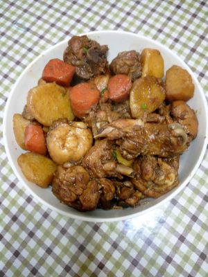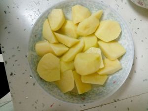土豆切斜刀块,胡萝卜也是,斜刀块。 没有胡萝卜的图 再准备些姜丝葱花~