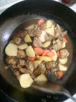 大火炖10-15分钟,炖到汤汁变少。 加入半瓶啤酒,切好的土豆倒入。 加入适量盐 继续炖-,到土豆软绵之后,开盖大火收汁。