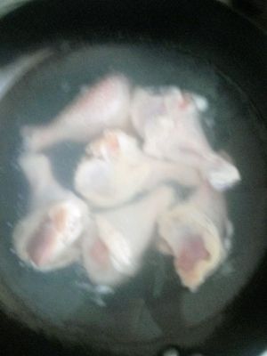 用的是鸡腿肉,因为是冰的。 所以先过下水解冻,再洗干净。