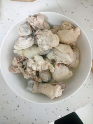 鸡肉洗干净后,剁成块。 再过一遍开水煮,然后就是现在这个样子,备用了。