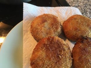 把炒好的菜加入土豆泥中混合均匀,捏成饼状,裹一层淀粉,在裹上一层蛋液,最后在裹上一层厚厚的面包糠。