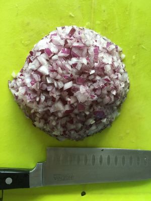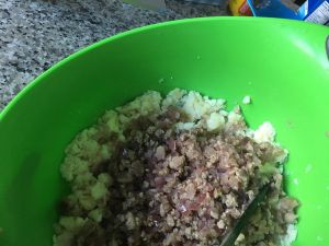 把炒好的洋葱加入压好的土豆泥里拌匀