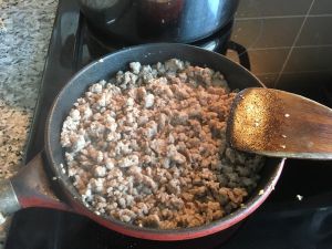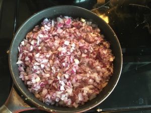 肉馅炒熟之后加洋葱一起炒熟,炒到洋葱微微金黄