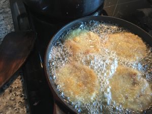 热油下锅。炸至表面金黄,因为里面本来就是熟的,所以不需要炸很久