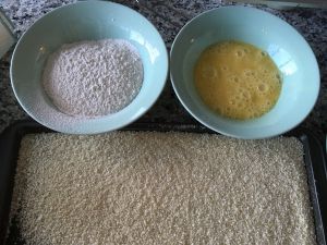 准备鸡蛋液、玉米淀粉、甘汁园面包糠