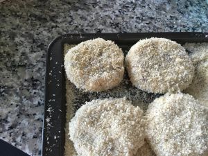 用手整理按压出形状,里面包入芝士,裹上玉米淀粉,再裹上鸡蛋液,再裹一层面包糠