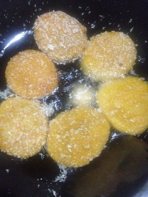 把做好的南瓜饼放入面包糠中,沾上面包糠,铁锅加油,低温入锅,火不要太大,防止饼炸糊了也没熟