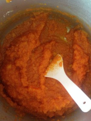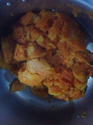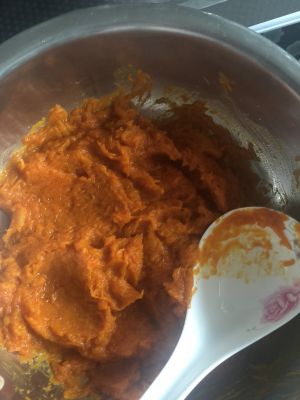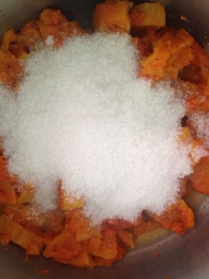 压成泥,因为南瓜热的时候加糖,糖融化了就会有汁