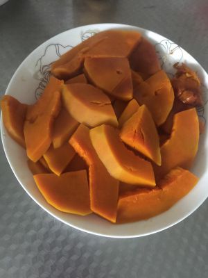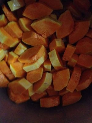 南瓜去皮切块,高压锅放两碗水,倒进南瓜盖上盖子,开火压一下