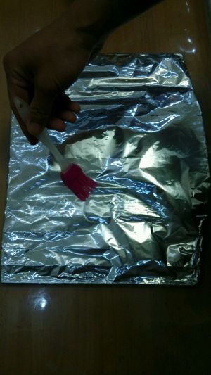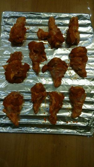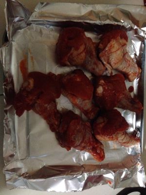 第二天取出腌好的翅根,摆放入有锡纸的烤盘中,再用刷子蘸些料汁在翅根(鸡翅)上。
