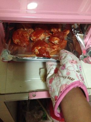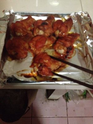 烤盘垫锡纸,放在烤箱的最下层,方便接烧烤过程中鸡翅流下的油,鸡翅放在中层。 烤12分钟后取出,翻面,再刷一次调料和蜂蜜,继续烤。 10分钟后把鸡翅挪到烤箱的上层,烤5分钟,表面焦黄即可。