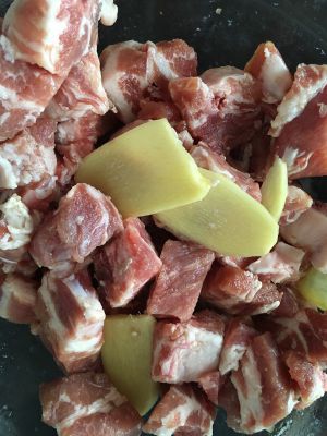 先将排骨洗干净,切小块一点哦。再放点生姜片抓几下,放个十五分钟左右。