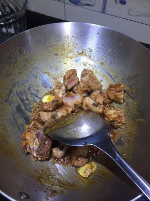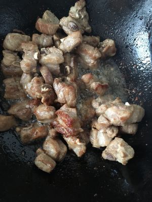 然后把小排盛出,把锅里水倒掉冲洗干净。然后把小排放入,到点酱油(两汤勺即可)上色。然后把酱油沥出放入小碗中,过会还用,把小排盛出。
