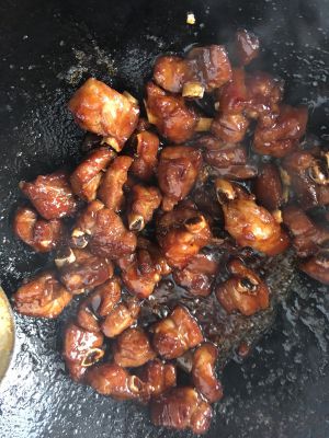 待糖色冒大泡后转小泡的时候放入焯好的小排翻炒均匀,让排骨上都裹上糖色。把炒好的排骨盛出来。
