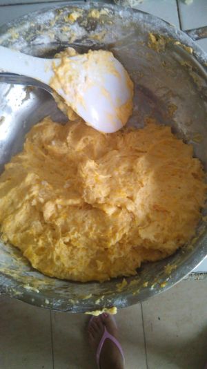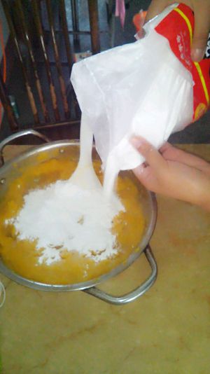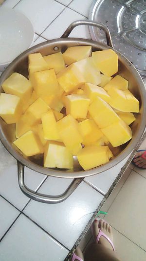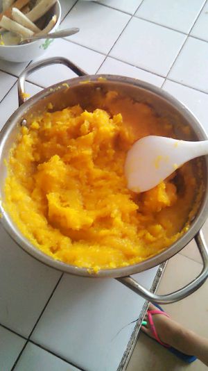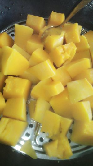 老样子南瓜蒸熟。蒸好加糖。一起压成泥。