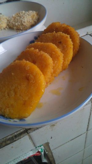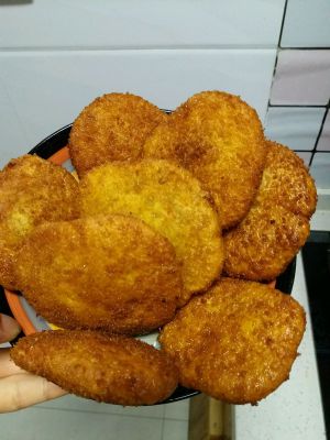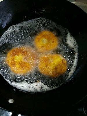 捏成圆装,压扁然后裹上面包糠就可以下油锅,炸成金黄色就可以起锅了。