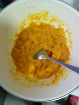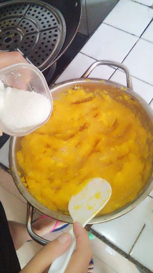南瓜趁热加入适量白糖,用工具把南瓜按压成糊状。
