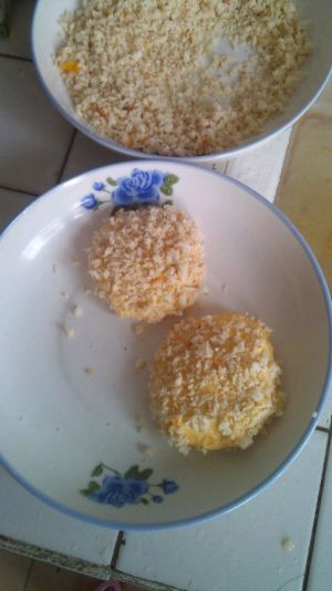 压扁放入豆沙包成球状 再压扁裹上一层面包糠