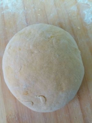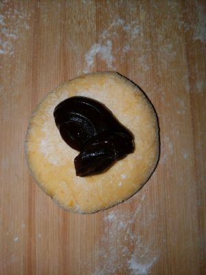 把揉圆好的面团拍扁。放馅。收口。面团上的是用牙签压成米字。