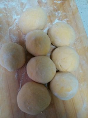 这个时候开始弄馅。揉圆。我做的是南瓜面团50克馅20。馅是我做月饼的时候剩的。