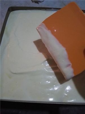 将蛋糕糊倒入28*28烤盘中,烤盘垫上油布。轻震几下烤盘震出气泡。