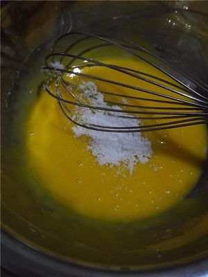 加入蛋黄,(鸡蛋分离,蛋清放入干净的无水无油的容器中)