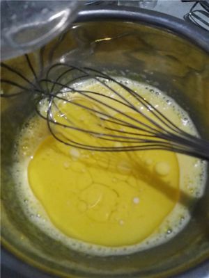 打蛋盆里倒入牛奶和玉米油用手动打蛋器搅匀