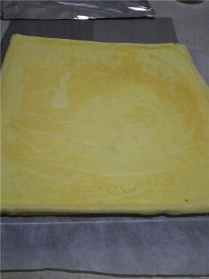 蛋糕烤好取出晾凉,切掉边角料,摸上奶油卷起,可以借助擀面棍,卷好放入冰箱冷藏