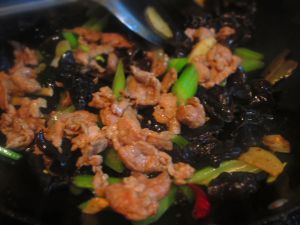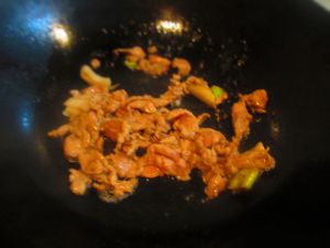 放入里脊片,利用锅里余油,翻炒至肉片颜色变白变浅。