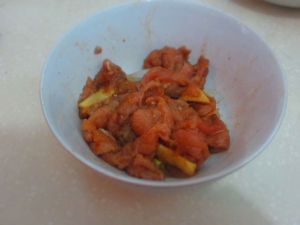 肉加入淀粉、葱姜、酱油。胡椒粉腌制