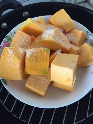 南瓜去皮切块,撒上些细糖 放锅上蒸熟