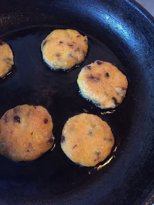 做好的南瓜饼可以在外面加上面包糠或者芝麻