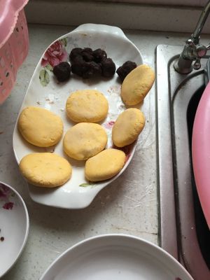 取20克南瓜球搓成圆形,加入10克豆沙馅包成圆球,搓好以后轻轻按平