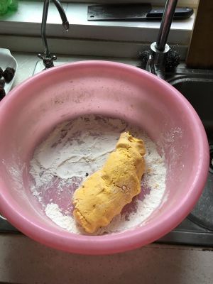 南瓜去皮切块隔水蒸熟,加上糯米粉和糖揉成团