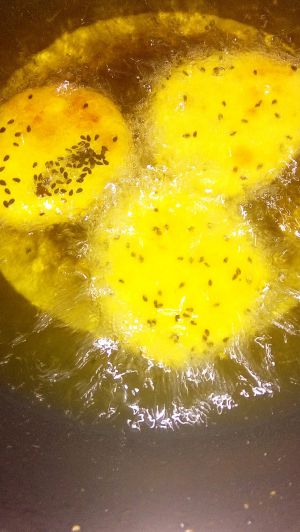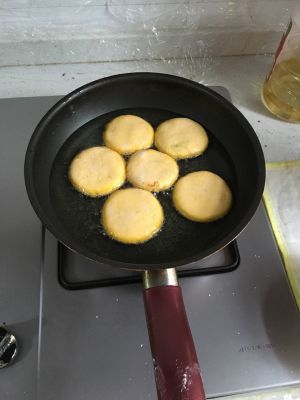 油烧热,小火,放入南瓜饼油炸,煎成两边金黄,捞起来沥干油。