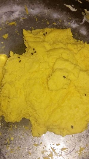 蒸熟的南瓜搅拌成泥加入适量的白砂糖和糯米粉,和成面团