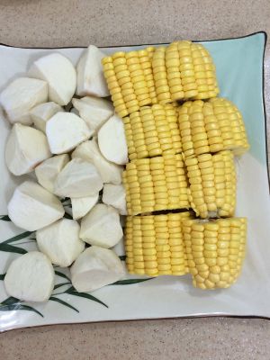 玉米切成四段在从中间切开,茨菇洗干净,一切四半