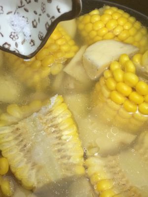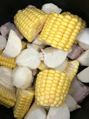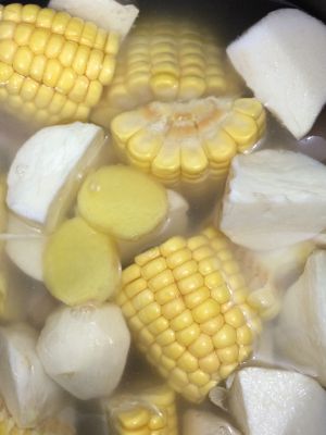 一小时后放入玉米,枸杞和食盐继续炖煮一小时。
