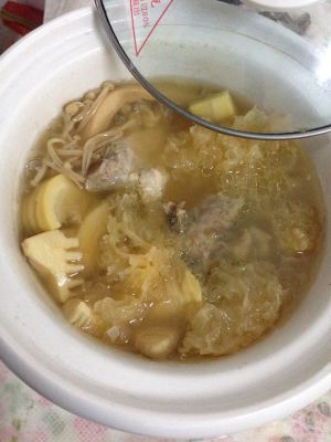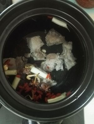 除排骨外所有食材均入盅,加水加热至沸汤后加入排骨。
