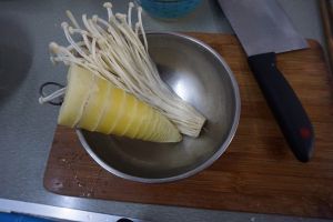 趁这个时间处理春笋和金针菇。春笋洗净外皮用刀一劈两半再去皮又快又省事。金针菇洗净后切去后面硬蒂。