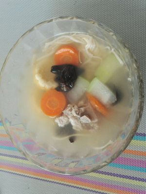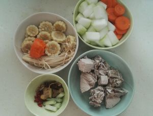 然后加入玉米(熟玉米)、胡萝卜炖10分钟。再加入冬瓜、金针菇、木耳,炖5分钟。
