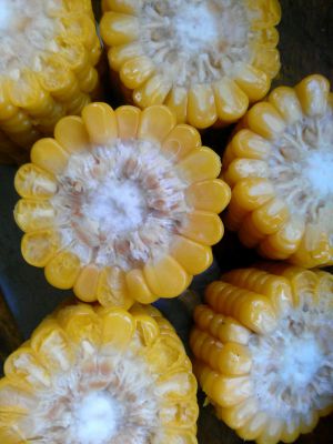 玉米切成2-3厘米的块,海鲜菇洗净切去根部,香菇刻上花刀