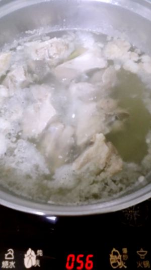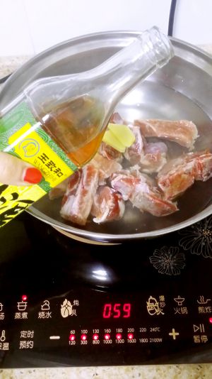 排骨洗净,凉水入锅倒入适量料酒,放入姜片烧开。