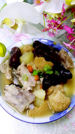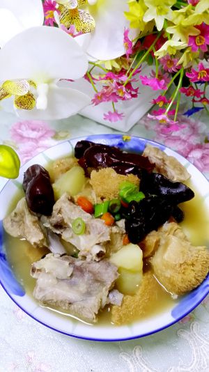 冷水放入排骨,烧开后放入猴头菇,干枣,枸杞子,土豆(山药)木耳,转中小火熬制1个小时。
